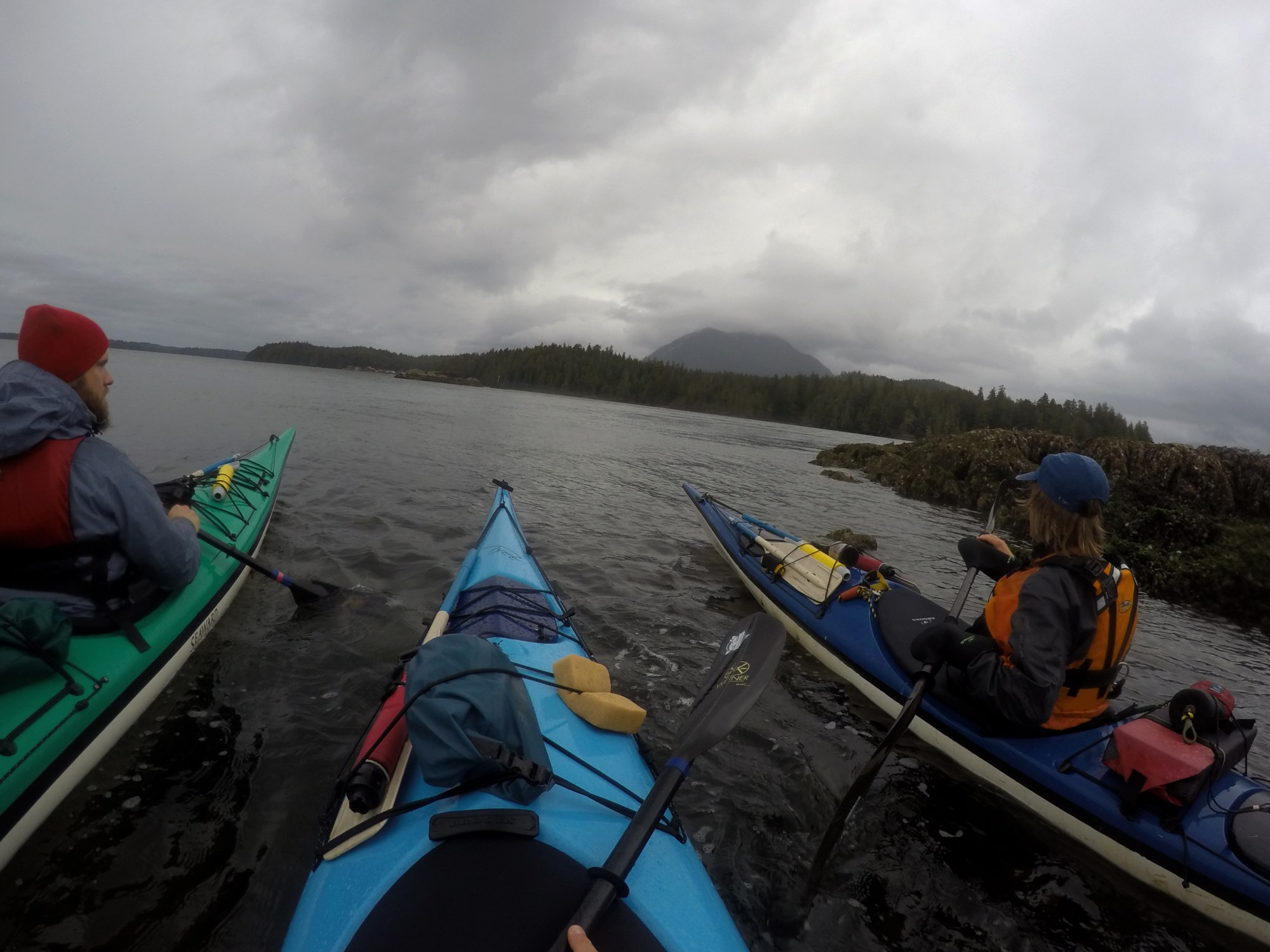 Plötzlich ist der Strömungskanal durchquert, die Wellen sind Geschichte und wir befinden uns im Schutze einer kleinen Insel, ebenso ebbt der Wind etwas ab und der Regen lässt nach – ach kuck, schon viel besser. Dank der ersten 15 minütigen Reifeprüfung weiß ich jetzt aber dank des learning-by-doing Crashkurses auch in etwa, wie (m)ein Kayak tickt, wie es funktioniert und wie ich wohin steuern kann.